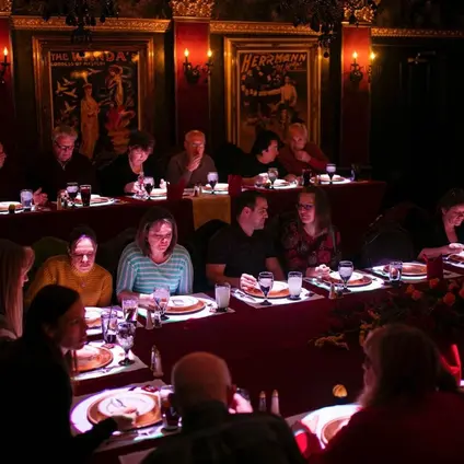 Mystique Dining and The Prestige are sister properties sharing the same unwavering commitment to world-class magic, exceptional dining, and memories that last a lifetime. Where Mystique's Grand Dining Chamber seats an intimate few, The Prestige Parlour opens its cabaret-style doors to up to 60 guests — a larger stage, the same extraordinary standard.